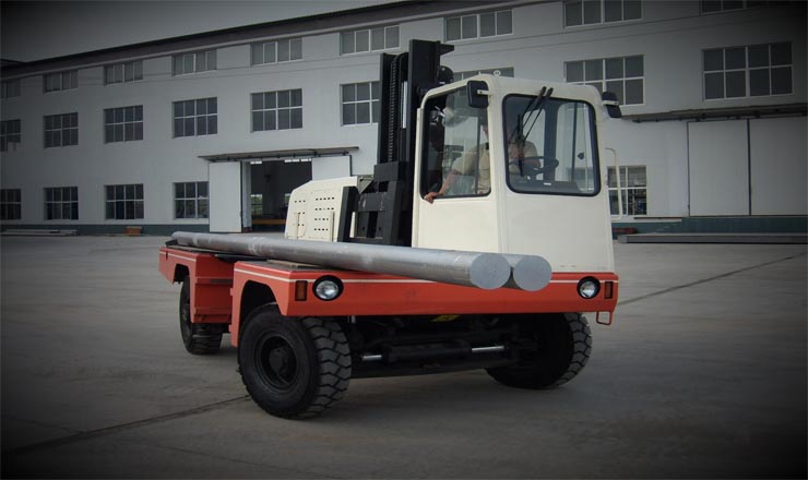 運(yùn)輸時(shí),所叉取的長(zhǎng)條形貨物安放在車身一側(cè)貨臺(tái)上,搬運(yùn)、堆垛過(guò)程中,通過(guò)性好,機(jī)動(dòng)性高。