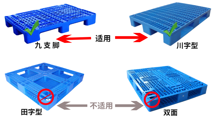 本款叉車只適用于九支腳托盤和川字型托盤,不適用于田字型托盤和雙面托盤。請先確認(rèn)好自己已有托盤底部結(jié)構(gòu)是否適合后,再進(jìn)行下單購買。