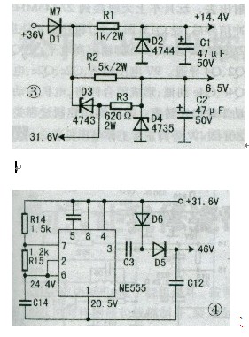1.穩(wěn)壓電路 :該控制器的穩(wěn)壓電路如圖3所示(圖中 元件位號為自編號)。其電路較簡單,采用電 阻降壓、穩(wěn)壓二極管穩(wěn)壓,此方式已被越來 越多的無刷控制器所采用。     由于該控制器采用了無刷電機專用控 制芯片MC33035,加之驅(qū)動電路供電由 NE555升壓后供給,所以對穩(wěn)壓電源的輸出 功率要求較低,采用穩(wěn)壓二極管穩(wěn)壓即能滿 足需求。     電池電壓+36V一路經(jīng)R1降壓‘、.c1濾 波后得到約+14.4V電壓,為MC33035DW 及過流、欠壓檢測IC(LM358)供電;另一路 經(jīng)R.2、I)4、C2穩(wěn)壓至6.5V,為轉(zhuǎn)把及霍爾 供電(此電壓在控制器所附的接線說明圖中 標注為5V,但實測為6.5V)。另外,此電源中 31.6V的取法較特殊,利用穩(wěn)壓二極管D3 的穩(wěn)壓特性,將R3和D4上的電壓穩(wěn)壓 為+31.6V,作為NE555的供電電源。圖中 D1為防反接二極管,防止因電池正負極連 接錯誤損壞電路。     值得一提的是,該電路中的穩(wěn)壓二極管 的型號標注分別為4744.、4743、4735,其實測 穩(wěn)壓值分別為14.4V、12.2V、6.5V。此類穩(wěn)壓 二極管標注不同于常規(guī)標法,難以通過型號 得知其穩(wěn)壓值。實修中,可換用相同或相近 穩(wěn)壓值的穩(wěn)壓二極管,但功率應不小于1W。