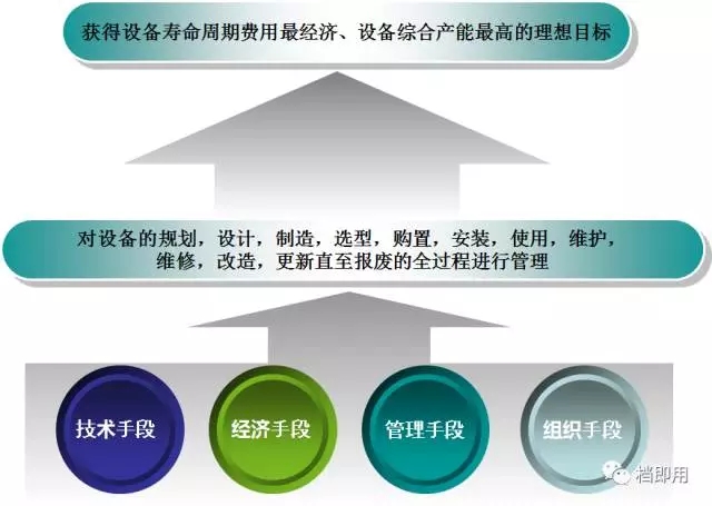 以生產(chǎn)經(jīng)營(yíng)為目標(biāo),通過(guò)一系列的技術(shù),經(jīng)濟(jì),組織措施,對(duì)設(shè)備的規(guī)劃、設(shè)計(jì)、制造、選型、購(gòu)置、安裝、使用、維護(hù)、維修、改造、更新直至報(bào)廢的全過(guò)程進(jìn)行管理,以獲得設(shè)備壽命周期費(fèi)用最經(jīng)濟(jì)、設(shè)備綜合產(chǎn)能較高的理想目標(biāo)。