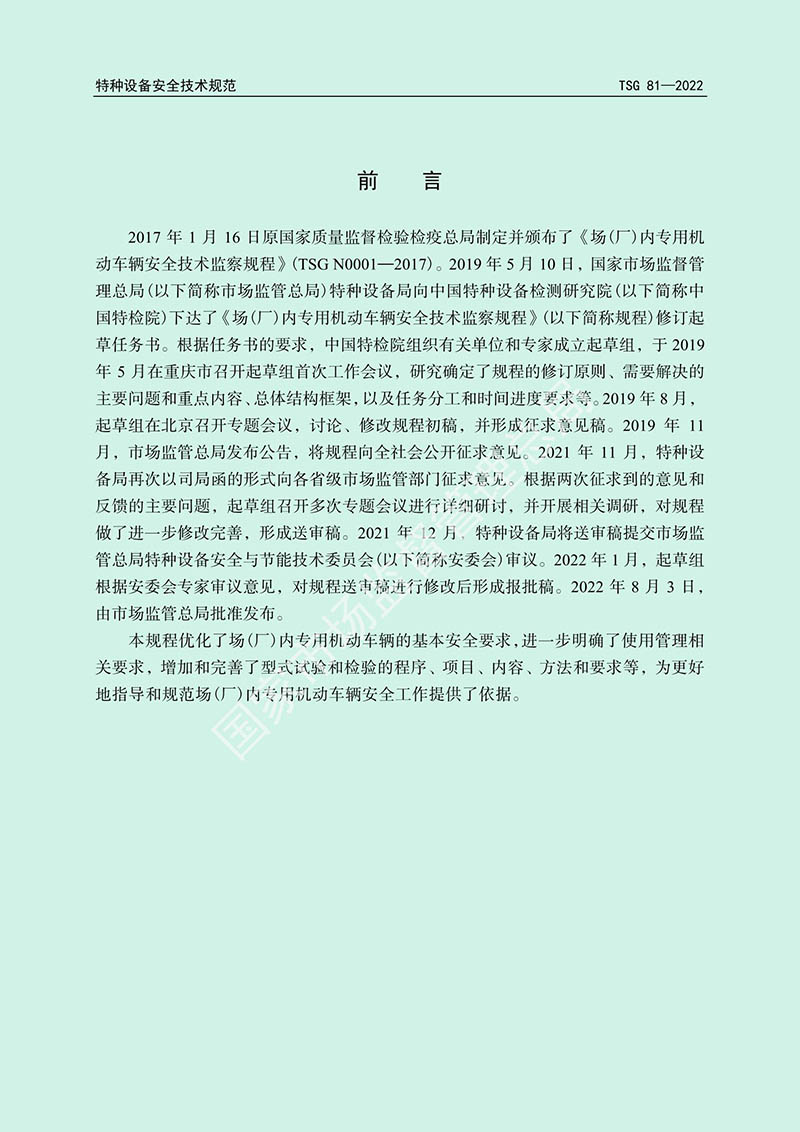 為貫徹落實《中華人民共和國特種設備安全法》《特種設備安全監(jiān)察條例》,進一步優(yōu)化場(廠)內專用機動車輛安全監(jiān)管措施,市場監(jiān)管總局對《場(廠)內專用機動車輛安全技術監(jiān)察規(guī)程》(TSG N0001—2017)進行了修訂,形成《場(廠)內專用機動車輛安全技術規(guī)程》(TSG 81—2022),現予公告,自2022年12月1日起施行。